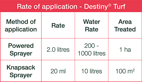 Destiny® Turf may be applied to both newly sown (2 months after sowing) and established turf. New turf should be treated in the spring provided that at least two months have elapsed between sowing and application.